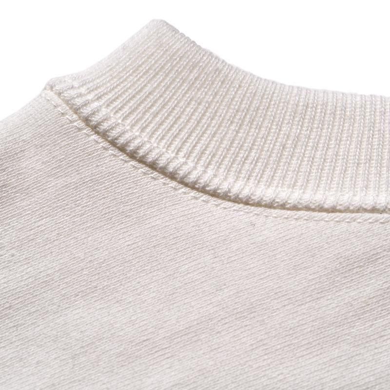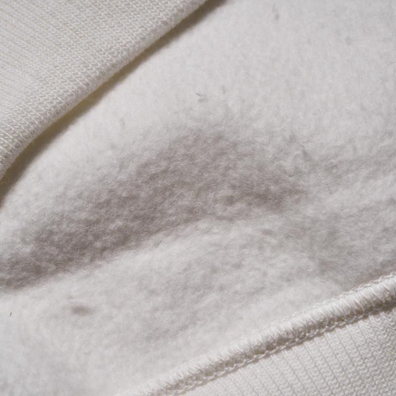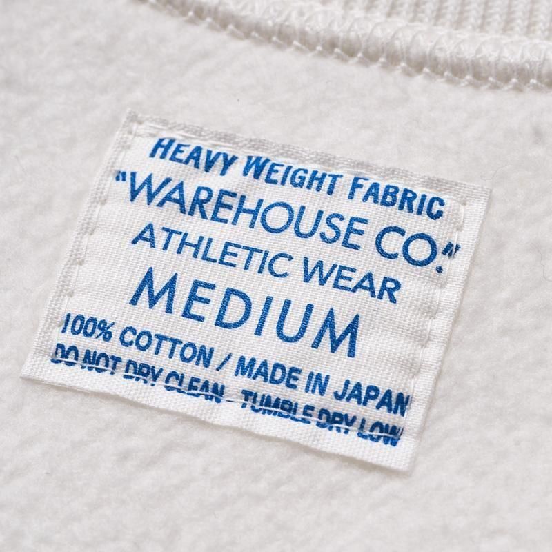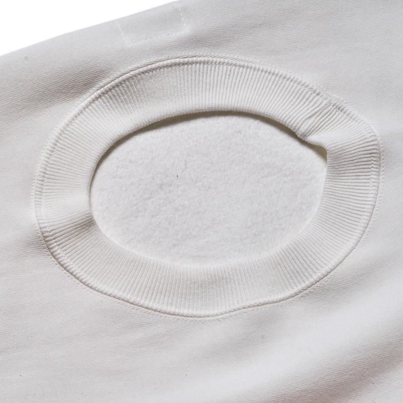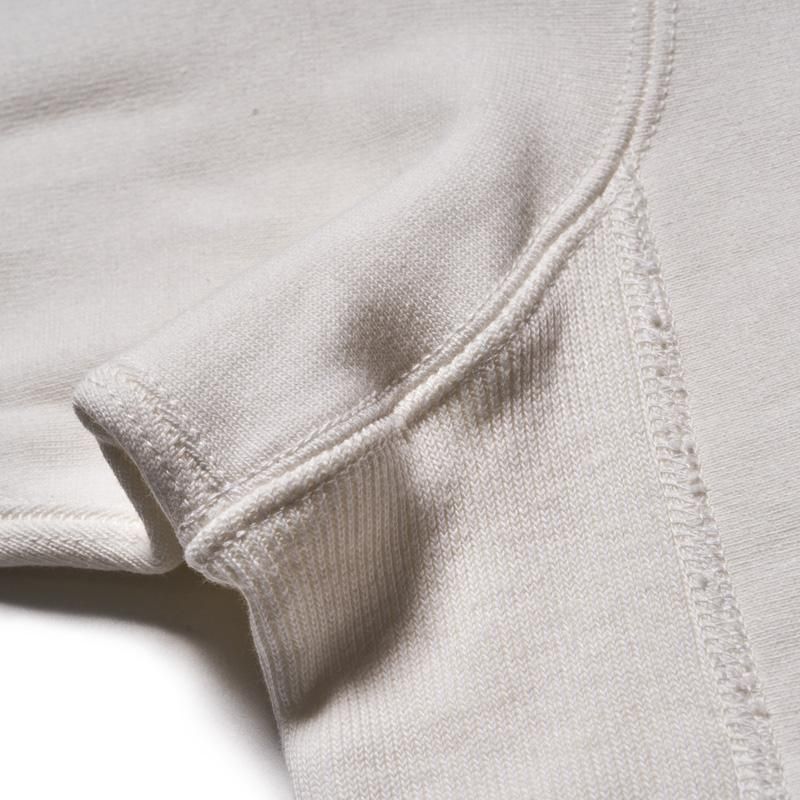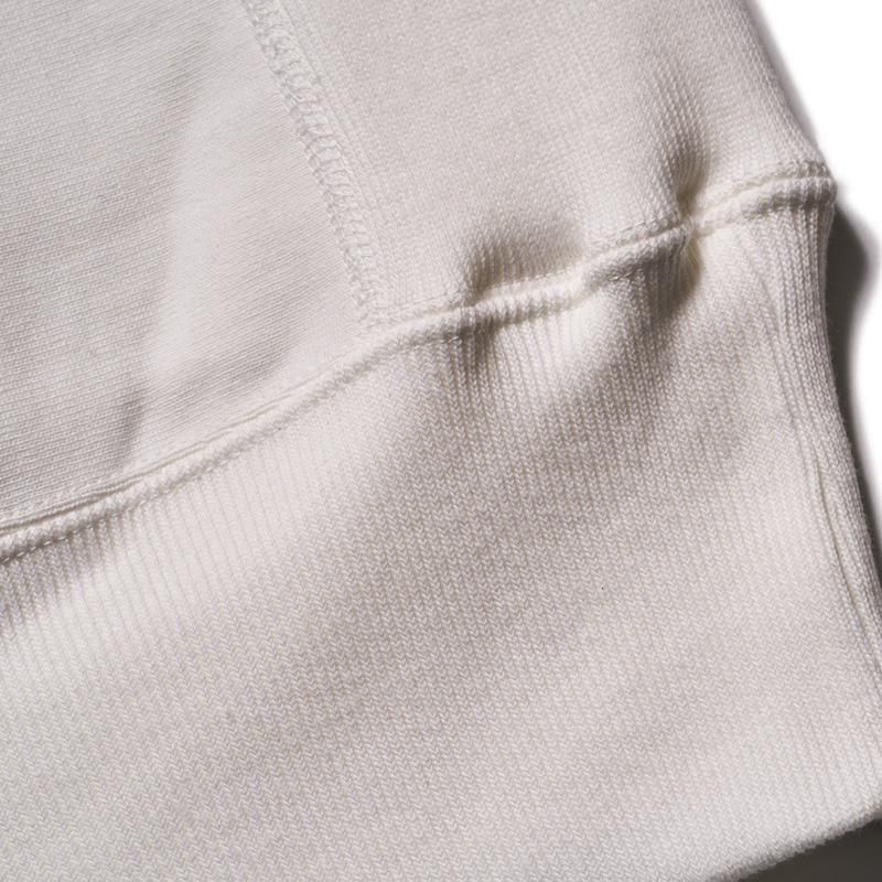 このスウェットシャツを手に取ってみると、まずは、その「重さ」に驚くことでしょう。1960年代のRWタイプを再現するために試行錯誤を繰り返した新開発のスウェットシャツ。縮みを軽減するために生地をヨコ使いした画期的なこのアスレチックスウェットは、サイドのパネル使いなどに目をとられがちであるが、その特性は「糸」にあります。徹底した度詰めで編まれたその生地は、硬いが弾性があり、重いがふわりとした柔らかさがあります。そしてウエアハウスがこだわるのは生地の「目」です。「生地の目が立つ」というのは、通常のスウェットでは、「タテ筋」だが、こちらRWモデルでは「ヨコ筋」です。目を立たせるために、糸の番手はもちろん、度の詰め方など、何度もその組み合わせを変えました。そしてたどり着いたのが、スウェットとしては珍しい「引きそろえ」である。通常はそれぞれ1本の糸を表、中、裏に組み合わせて編むスウェットであるが、引きそろえにすることで度を詰めやすくなりました。さらに吊り編み機の特性により、生地の弾性を保ったまま硬く、表面の目を立たせることができるようになったのです。歴史上、後発に採用されるシンカー編み機では、同じ糸の規格でもってしても、硬くなりすぎてしまい、編上がりの違いは歴然としているといいます。出来上がった生地の「重さ」は、染色の際、また縫製においても熟練の作業を要します。染色の際には通常よりも負荷がかかるし、縫製でも軽いニットウェアのようにはいきません。生地、染色、縫製、すべての工程においての協力による「バトンリレー」が、このRWタイプのスウェットの「重み」なのです。そして、このRWモデルのオリジナルについても後述しておきます。驚くべきことに、「タタキタグ」と通称される60年代のヴィンテージの、生地の破れた部分を解析すると、「引きそろえ」の糸が露出していたというのです。アスレチックウェアとして、牧歌的でありながらも妥協することなく開発を試みた先駆者の精神は、「限りなきディテールの追求」によってこそ発掘されるのです。